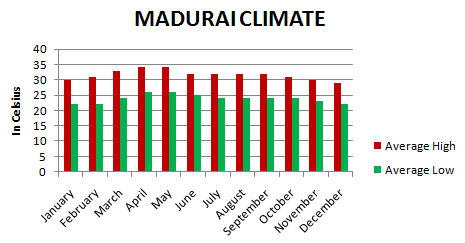 Madurai can be visited through out the year, however, Winter season from October to March is the best time to visit Madurai. January to February & April to May is the Peak season in Madurai and often hotels run full and tourist places are crowded.October to March is the best time to visit Madurai. With a hot and dry climate for most of the year, Madurai is best visited during the winter season. The town is known for its ancient temples and other architectural and religious masterpieces and receives a generous crowd of people throughout the year. Madurai is the most fascinating and welcoming during the months between October and March which coincides with its winter season.